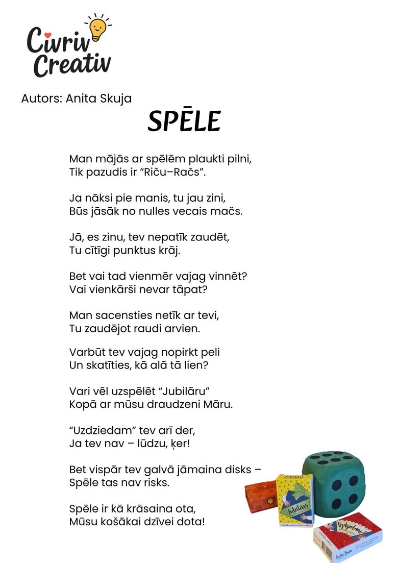 Cilvēki reizēm spēlējas pārāk nopietni. Aizmirst, ka spēle nav par uzvaru — tā ir par prieku, kustību, sirsnību un kopā būšanu. Tieši tāpēc es veidoju viesību spēles, kurās svarīgākais ir process, nevis rezultāts. Ar šo dzejoli gribu atgādināt - spēle ir domāta, lai mēs atbrīvotos, sadraudzētos un pasmietos. Reizēm arī par sevi!